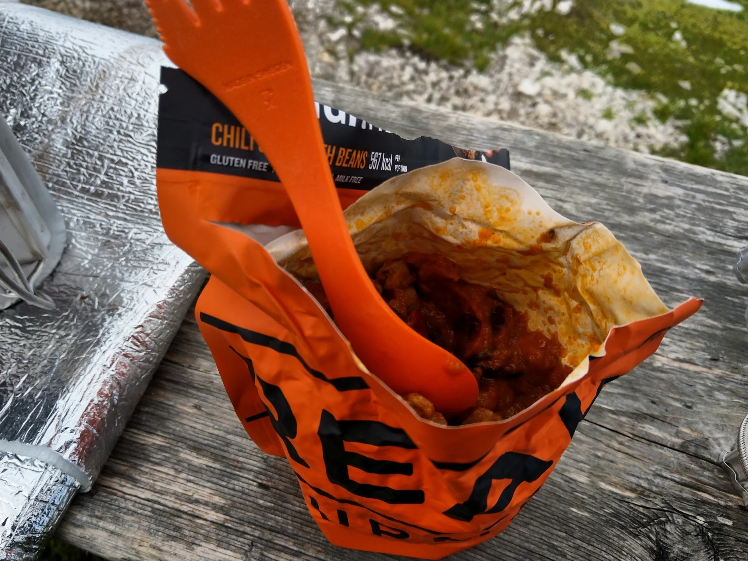 Die Bergfreunde wünschen einen guten Appetit mit der gefriergetrockneten Expeditions- und Trekkingnahrung „Chili Stew with Beans, also Chilieintopf mit Bohnen von Real Turmat. Einfach mit heißem Wasser aufgiessen, kurz warten und genießen.